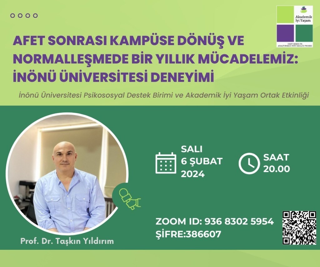 Depremin yıldönümünde İnönü Üniversitesi Afet Sonrası Psikososyal Destek Birimi ile ortak etkinliğimizde birim koordinatörü ve İnönü Üniversitesi PDR Bölümü öğretim üyesi Prof. Dr. Taşkın Yıldırım ile depremden sonra kampüse ve akademik yaşama dönmenin zorluklarını, birim olarak akademisyenlere, idari personele ve birincil yakınlarına sundukları psikososyal destek hizmetlerini konuştuk. Video kaydını buradan izleyebilirsiniz: