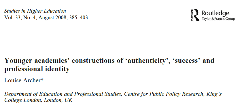 Archer, L. (2008). Younger academics’ constructions of ‘authenticity’,‘success’ and professional identity. Studies in Higher Education, 33(4), 385-403. https://doi.org/10.1080/03075070802211729