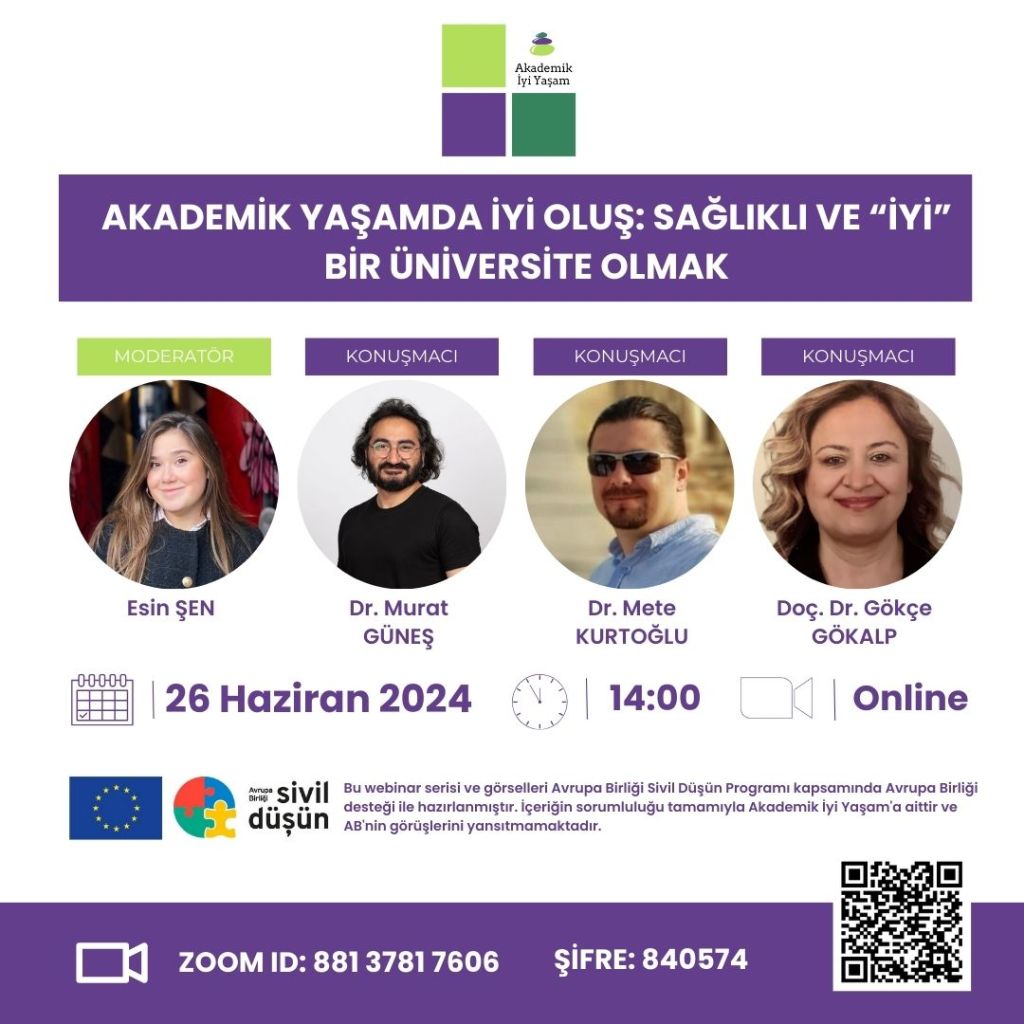 AB Sivil Düşün Programından aldığımız destek ile düzenlediğimiz ” ‘İyi’ üniversite olmak: Üniversite bileşenlerinin akademik yaşamda ruh sağlığı ve iyi oluşları” başlıklı webinar serimizin ilkinde “sağlıklı ve iyi bir üniversite olmak” konusuyla Dr. Murat Güneş, Dr. Mete Kurtoğlu ve Doç. Dr. Gökçe Gökalp ile bir araya geldik. Konuşmacılarımızla beraber sağlıklı üniversiteler, Araştırmacı Ruh Sağlığı ve İyi Oluşu Manifestosu ve Türkiye’deki Araştırmacı Ruh Sağlığı Politika Özeti hakkında konuştuk. Video kaydını buradan izleyebilirsiniz: